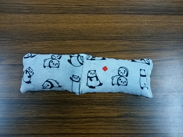 材料:小豆、布+糸(綿100%のをつかってね。ポリエステルとかの化繊を使うとレンチンで溶けるよ)