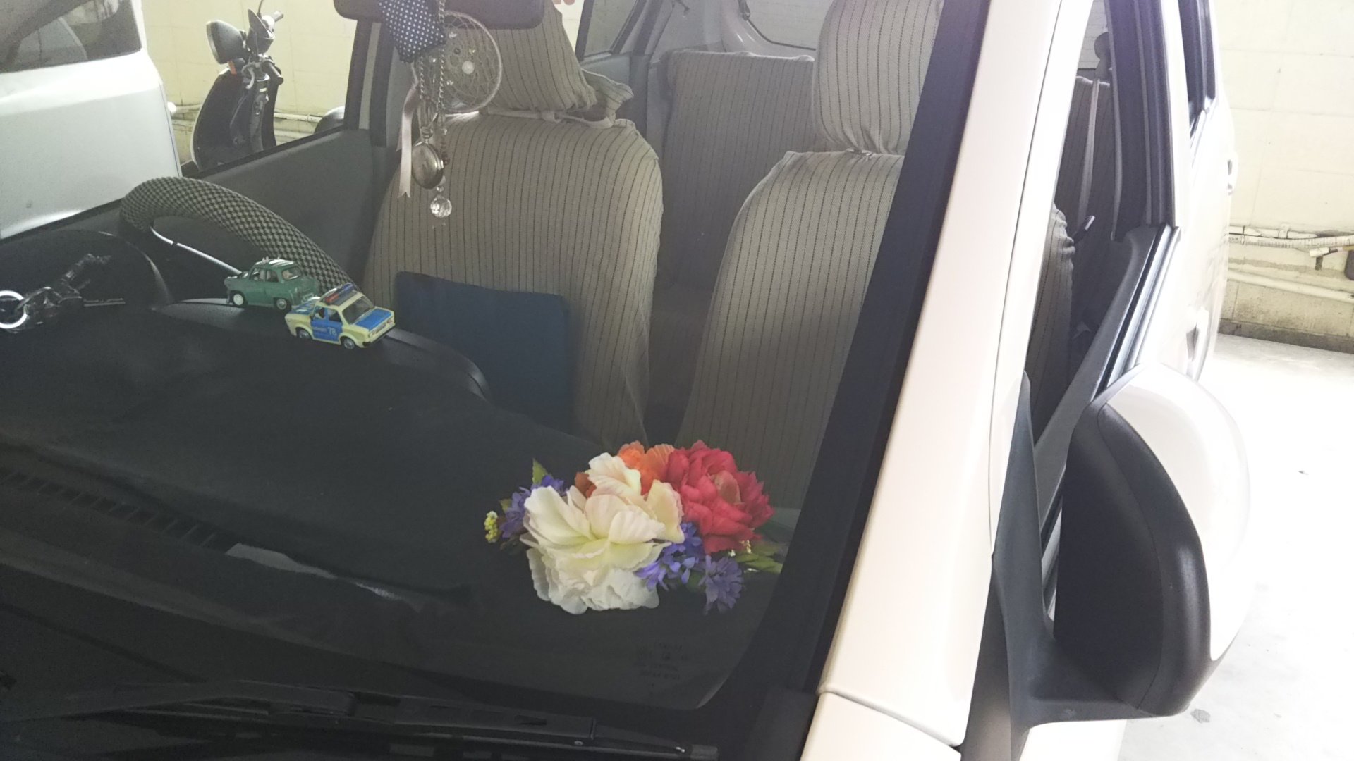 布面積が多いせいで結構お金かかってるように見えるかもしれんけど(ハンドルカバーとか、ミニカーとか、前の車からのもあるし)